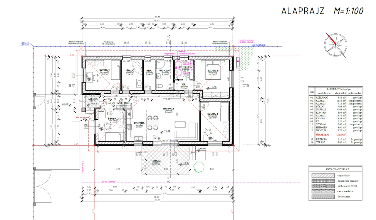 A tető héjazata antracit betoncserép lesz, a homlokzatok 15cm EPS, a padló 10cm Austrotherm AT-N100-as, a vízszintes födém 25cm Ásványgyapot szigeteléssel lesz ellátva.