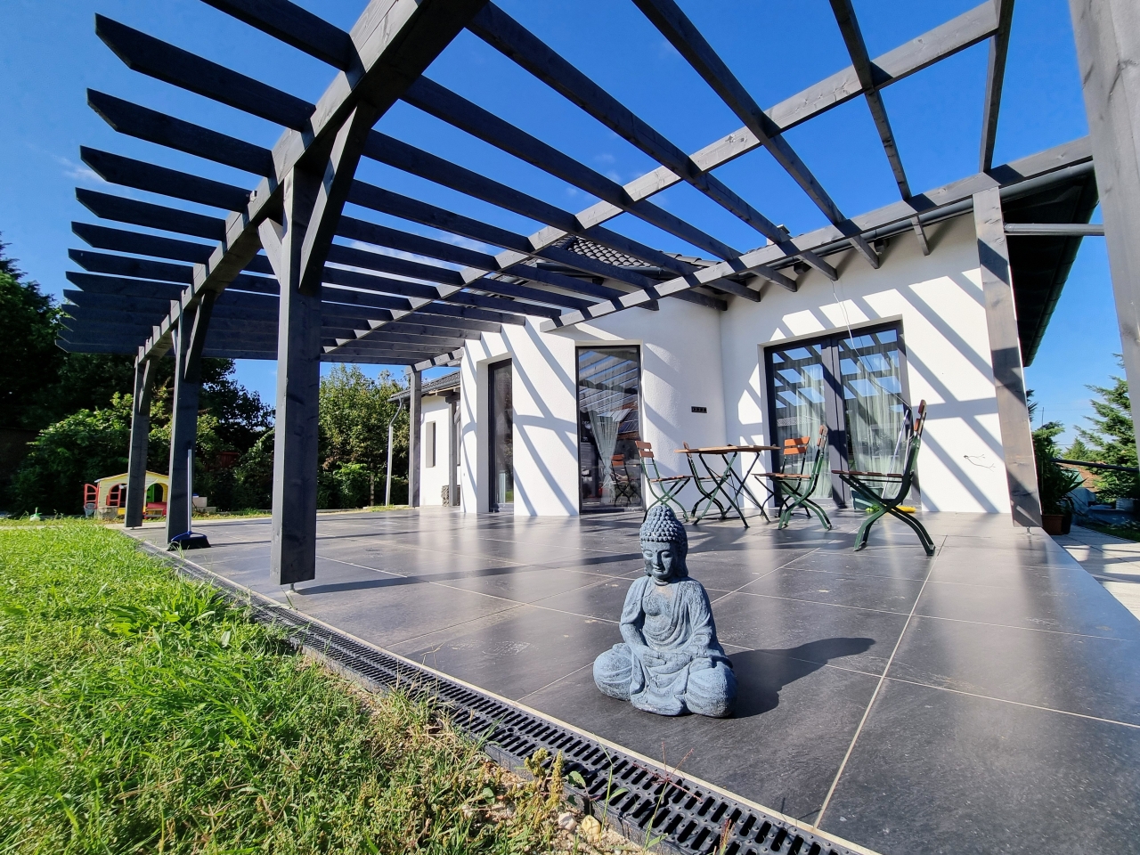A nappaliból közvetlenül egy hatalmas, ~50 négyzetméteres külső teraszra léphetünk, amely elegáns antracit színű, modern burkolatot kapott.