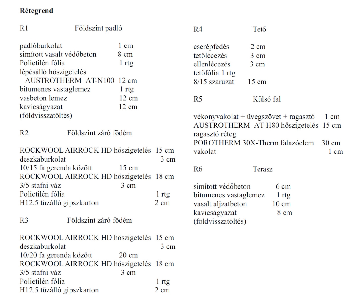 A padló 12 cm-es Austrotherm ATN-100-as lépésálló szigeteléssel, a homlokzatok 15 cm Austrotherm AT-H80 dryvit szigeteléssel, a födém 33 cm Rockwool Airrock HD ásványgyapot szigeteléssel lesz ellátva.